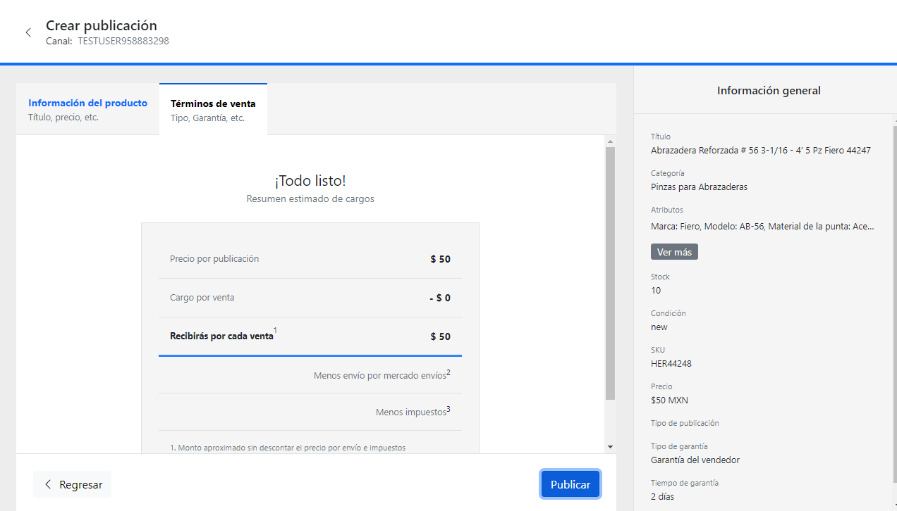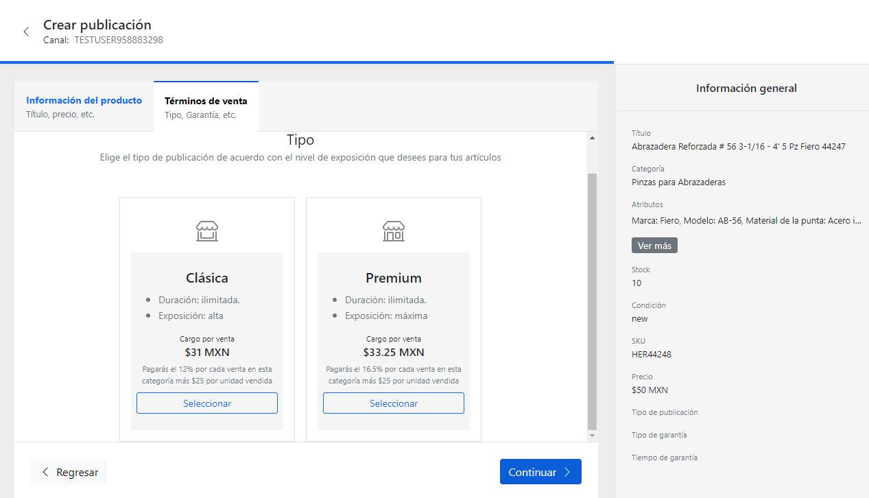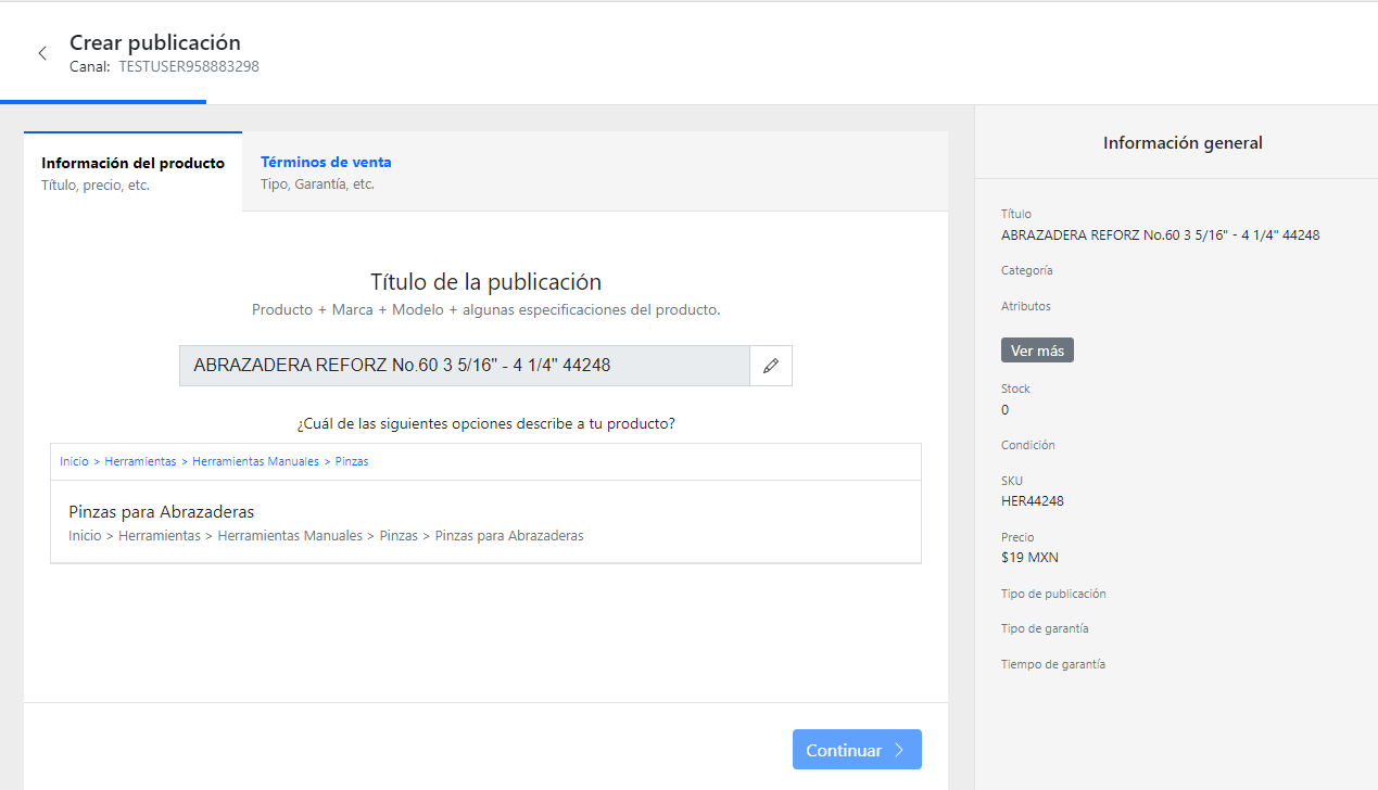 - Una vez concluida la configuración del producto seleccione precios y tipo de publicación
